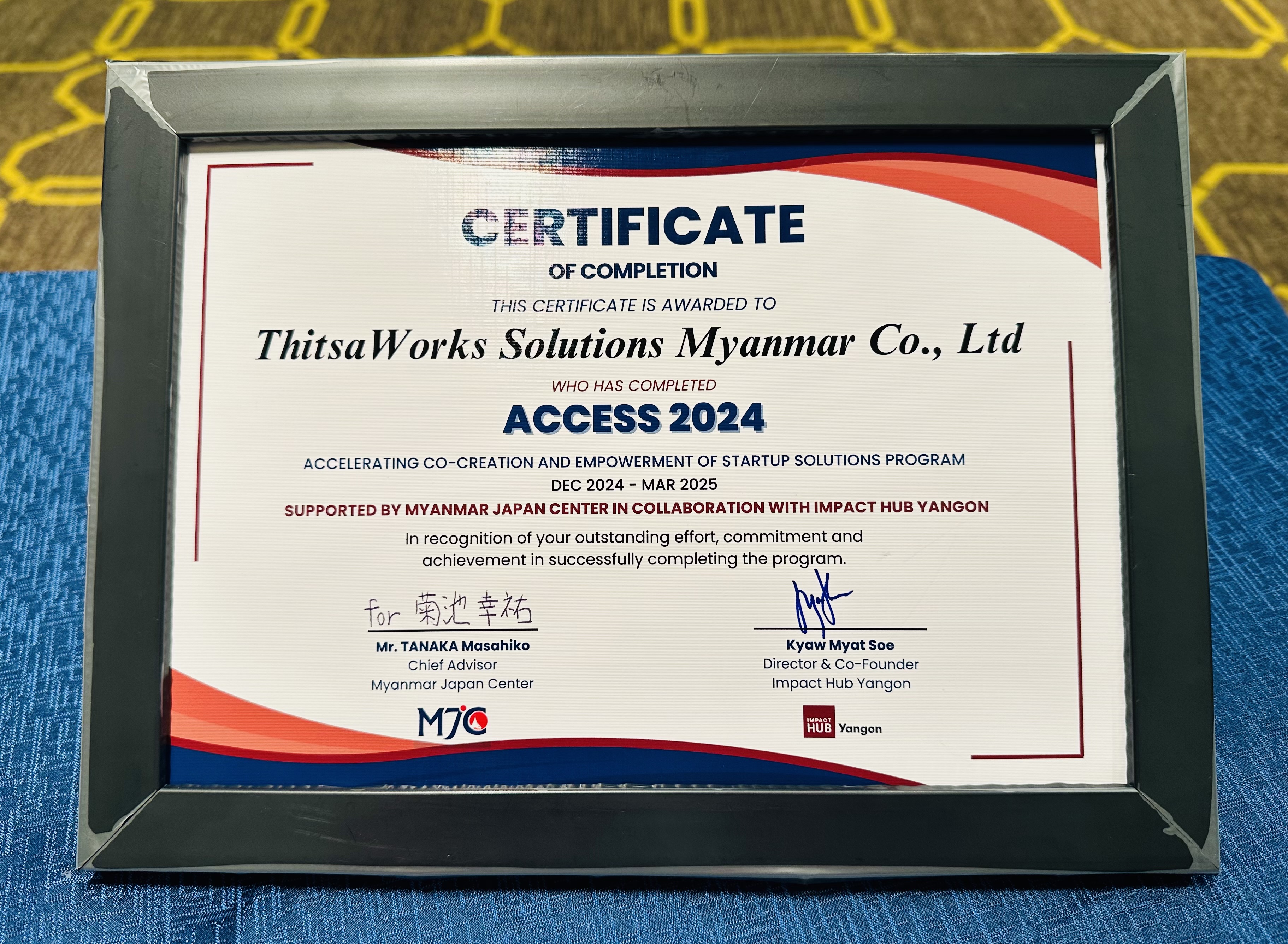 Impact Hub Yangon နှင့် Myanmar Japan Center တို့မှ ကြီးမှူးကျင်းပသော ACCESS 2024 Program တွင် Finalist နှင့် Winner ဆုများ ရရှိခဲ့ပါသည်။ ဤအစီအစဉ်သည် လက်ရှိကြုံတွေ့နေရသော လူမှုရေး၊ စီးပွားရေး စိန်ခေါ်မှုများကြားတွင် ပြည်သူလူထု၏ အသက်မွေးဝမ်းကျောင်းမှုကို တိုးတက်စေမည့် ဆန်းသစ်သော ဝန်ဆောင်မှုနှင့် ထုတ်ကုန်များကို ဖော်ဆောင်နေသည့် လုပ်ငန်းများကို ပံ့ပိုးကူညီပေးသော အစီအစဉ်ဖြစ်ပါသည်။